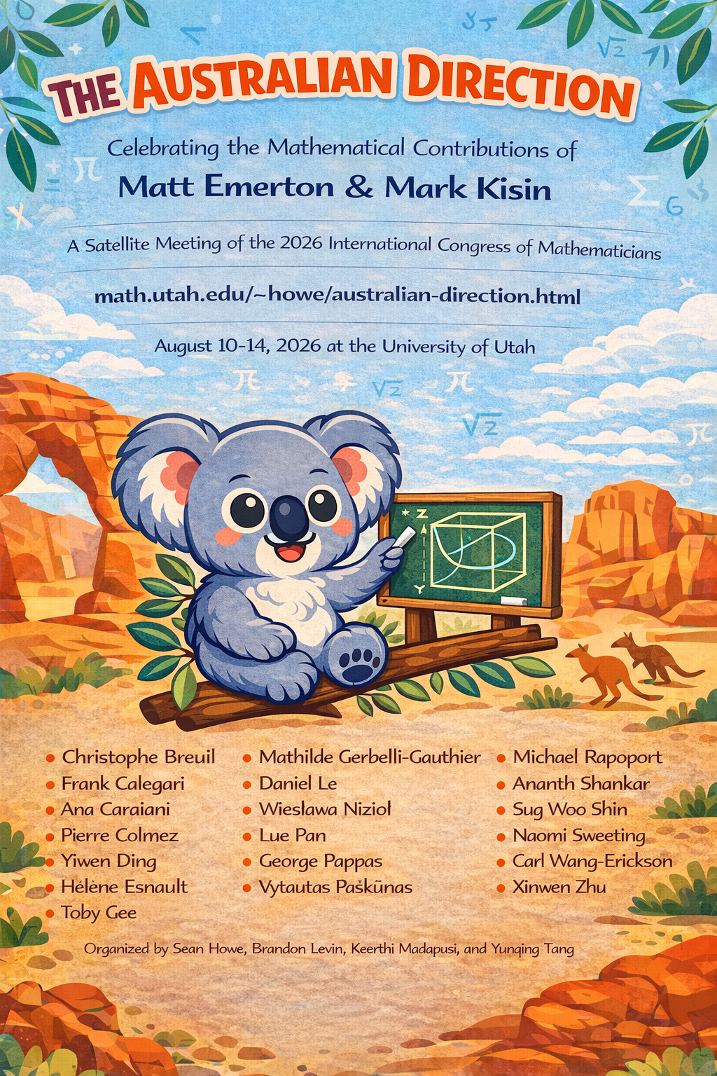¹In the study of the cohomology of algebraic varieties, there are two different "directions" in play: the "German direction," where one considers the coefficients of the equations defining an algebraic variety as varying in a family, and the "Australian direction," where one considers the coefficients of the cohomology theory itself as varying in a family. This terminology was introduced by Laurent Fargues [F] (in his talk at the 2015 summer algebraic geometry institute in Salt Lake City!) in the context of moduli of p-divisible groups to compare and contrast the moduli problems studied by Kisin with those studied by Rapoport and Zink. A broader comparison of these two directions has been emphasized, among other places, in Scholze's 2018 ICM talk [S], and has since grown into a useful dichotomy for understanding the many recent advances in the field, including the fundamental contributions of Emerton and Kisin. In this conference, we interpret the term "Australian direction" more expansively as including all areas of mathematics where the mathematicians Emerton and Kisin have made significant contributions.