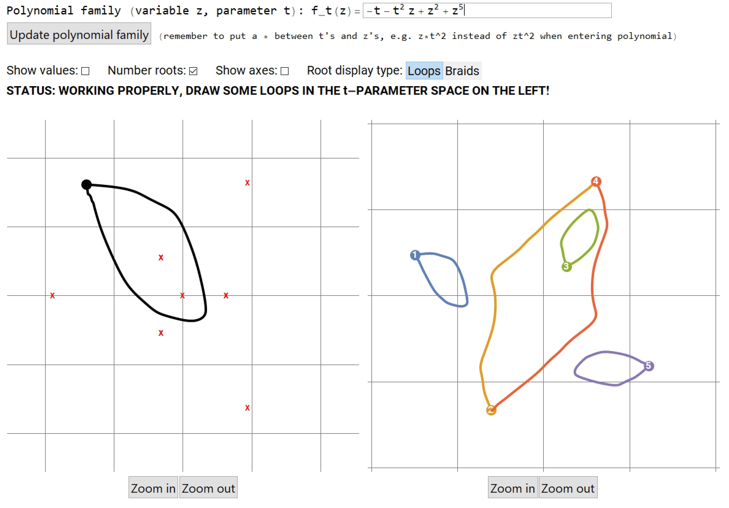 Root Loops is a Mathematica script which dynamically computes and draws the roots of a polynomial in one variable over the complex numbers as its coefficients change in a one parameter family. In the screenshot above, the loop in the coefficient parameter space has been drawn on the left by the user, and the loops on the right are the paths followed by the roots as the coefficients vary, computed automatically by the program. Root Loops can be used to teach and explore concepts such as: permutations, the fundamental theorem of algebra, the topology of covering spaces, Galois theory, and braid monodromy.